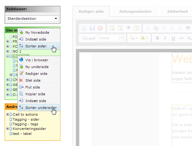 Man højreklikker på den side, hvor man gerne vil sortere undersiderne. Hvis man vil sortere hovedsiderne, så højreklikker man på overskriften "Din menu" eller "Andre sider".